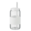 Bicchiere in vetro borosilicato alto con coperchio e impugnatura in silicone. Include cannuccia in vetro borosilicato. Capacità: 550 ml.